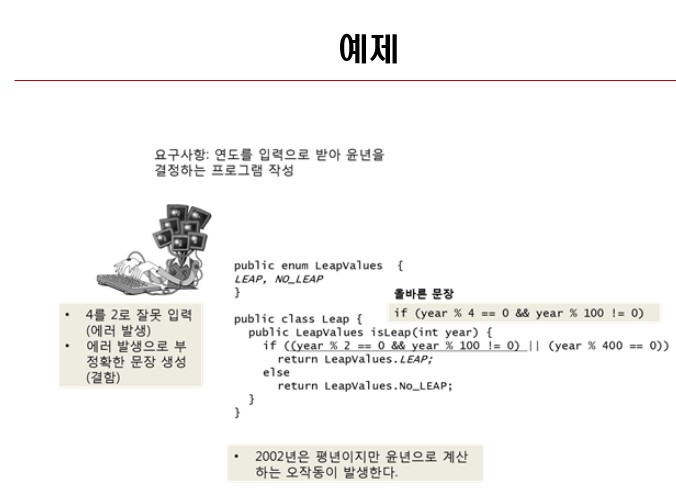 - 사용자의 요구사항을 잘못 파악 하거나 typo나 프로그래밍 언어의 문법을 잘못 이해하여 코딩하는 경우에 발생할 수 있다.