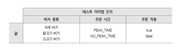 *테스트 아이템 인자(Test Item Parameter) : 프로그램 행위에 영향을 주는 인자 : 버거 종류, 주문 시간, 쿠폰 적용