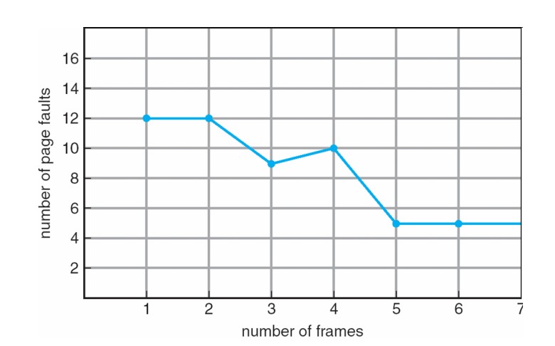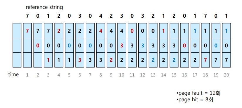 - 임의의 메모리 참조열(reference string)에 대해 알고리즘을 적용하여 page fault 회수 계산