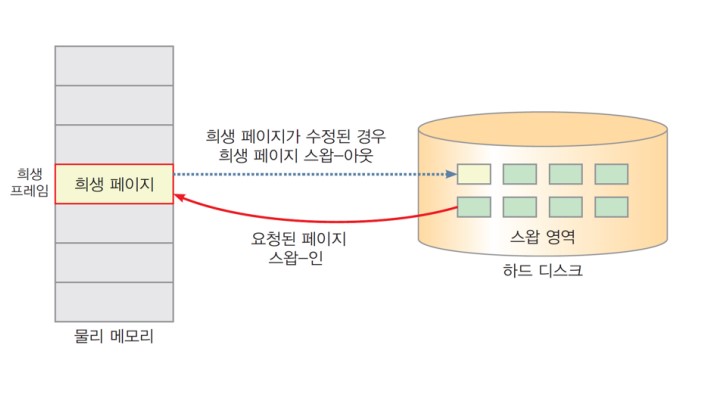 - 희생 페이지는 스왑-아웃, 요청 페이지는 스왑-인